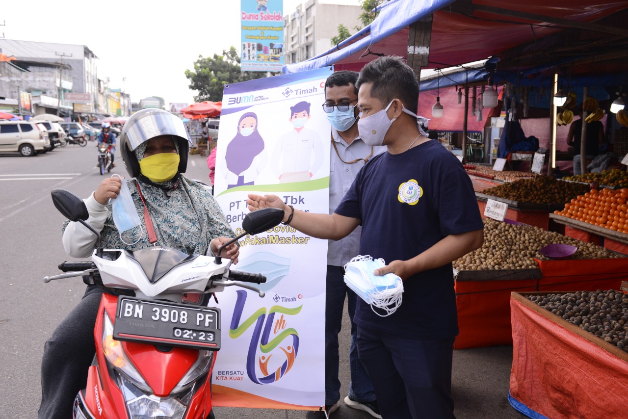 Melalui kegiatan yang bertajuk ‘PT Timah Tbk Berbagi Masker, Cegah Covid-19 #AyoPakaiMasker PT Timah membagikan 2.500 lembar di pusat-pusat keramaian seperti Pasar Pagi Kota Pangkalpinang, Warung Makan dan di areal Kantor Pusat PT Timah Tbk, Selasa (3/8/2021).