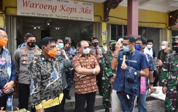 TANJUNG PANDAN – Menteri Pariwisata dan Ekonomi Kreatif RI, Sandiaga Uno, mengakui keindahan Belitung saat berkunjung dan menikmati santap pagi di Waroeng Kopi Ake Kawasan KV Senang, Tanjung Pandan, Kabupaten Belitung, Jumat (5/2/21).