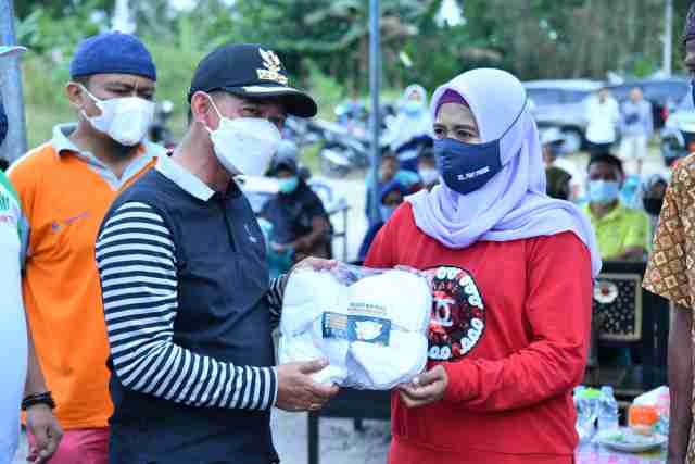 Dalam peluncuran Bupati Mulkan secara simbolis menyerahkan bantuan 50 paket beras dan masker untuk warga kurang mampu.