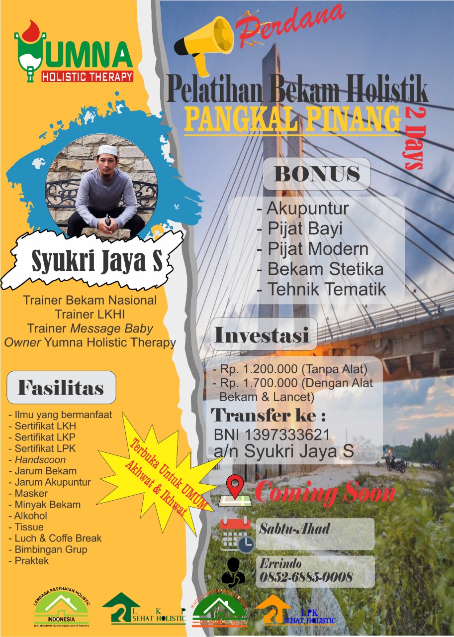 Di Pangkalpinang sendiri telah dibuka untuk pertama kalinya Pelatihan Bekam Holistik/Bekam Sunnah oleh LKHI (Lembaga Kesehatan Holistik Indonesia)