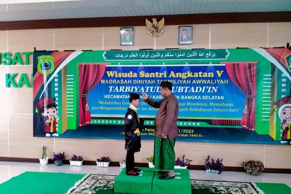 Siberindo.co.Pangkalpinang 54 santri Madrasah Diniyah Takmiliyah Aliyah (MDTA) Pondok pesantren (Ponpes) Tarbiyatul Mubtadi’in Toboali, Kabupaten Bangka Selatan (Basel), Provinsi Bangka Belitung (Babel) mengikuti prosesi wisuda, Kamis (9/6/2022).