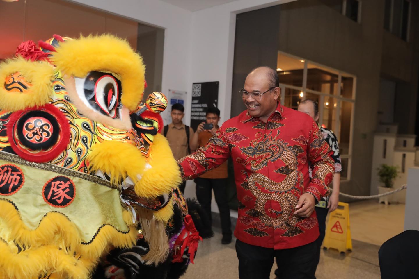 “Selamat Tahun Baru,” ucap Safrizal, sembari memberikan angpao kepada pemain Barongsai, yang menyambut kehadirannya di lokasi acara.