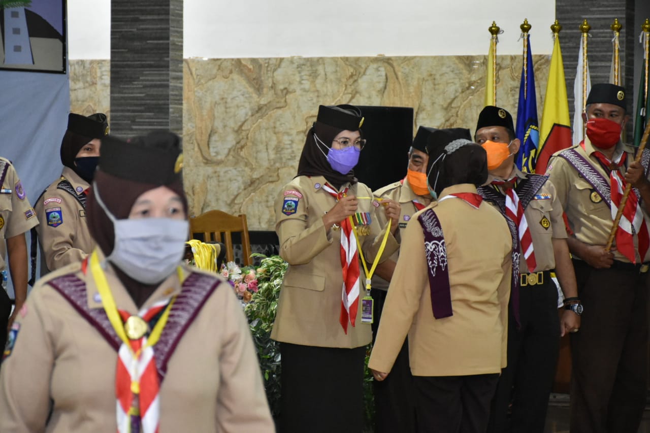 SIBERINDO, BABEL – Ketua Kwartir Daerah Gerakan Pramuka Provinsi Kepulauan Bangka Belitung, Melati Erzaldi menyematkan tanda peserta kepada seluruh peserta Kursus Pelatih Pembina Pramuka Tingkat Dasar (KPD) Gerakan Pramuka Kwartir Cabang Belitung yang dilaksanakan di Hotel Kelayang Beach pada 9-15 November 2020.