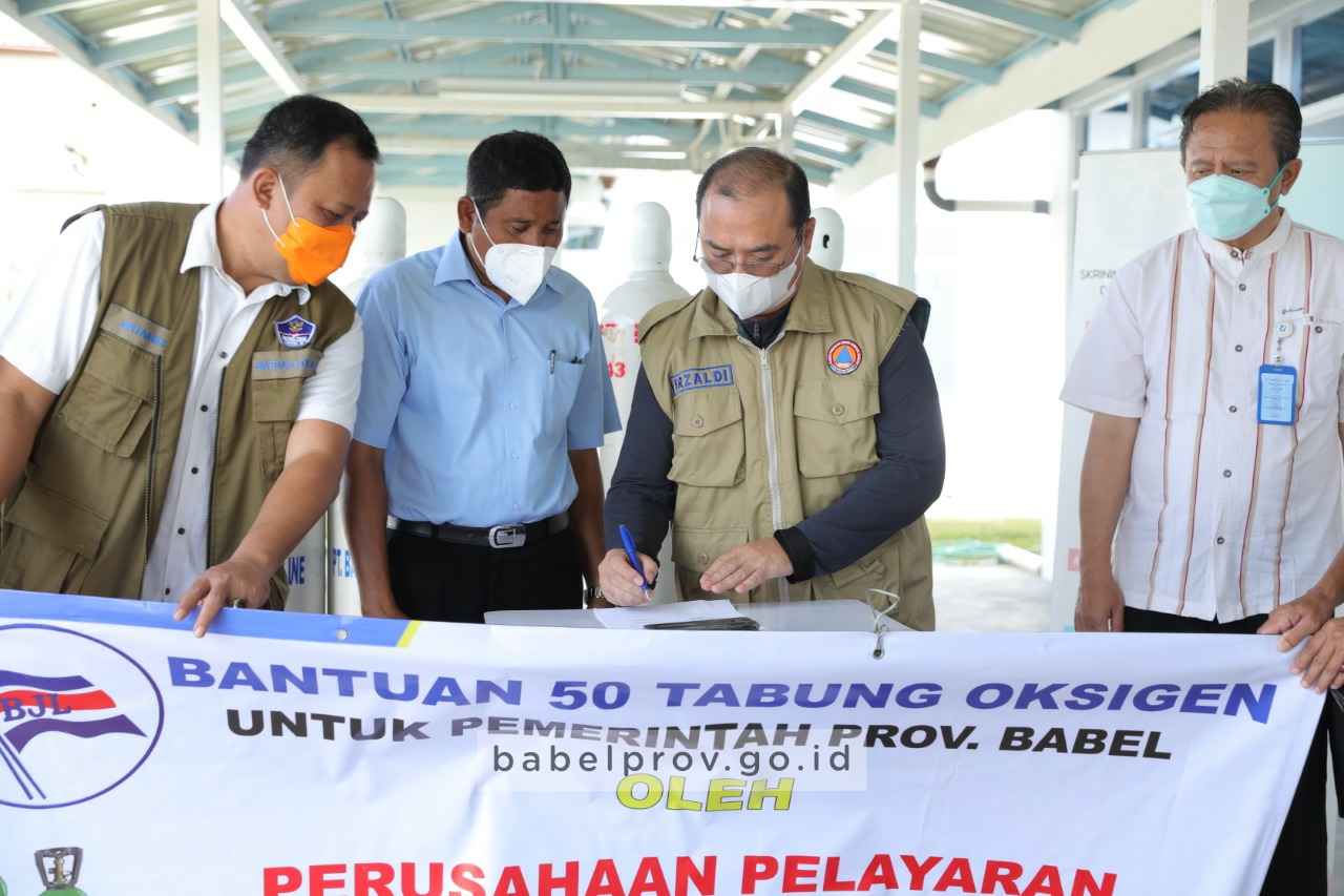 SIBERINDO, BABEL – Pemerintah Provinsi Kepulauan Bangka Belitung (Pemprov. Babel) menerima bantuan tabung oksigen sebanyak 50 tabung dari Perusahaan Pelayaran PT Bangka Jaya Line. Bantuan diterima langsung oleh Gubernur Erzaldi Rosman dan Kepala Dinas Babel Andri Nurtito di Rumah Sakit Umum Daerah Dr. (HC) Ir. Soekarno Babel, Rabu (11/8/2021).