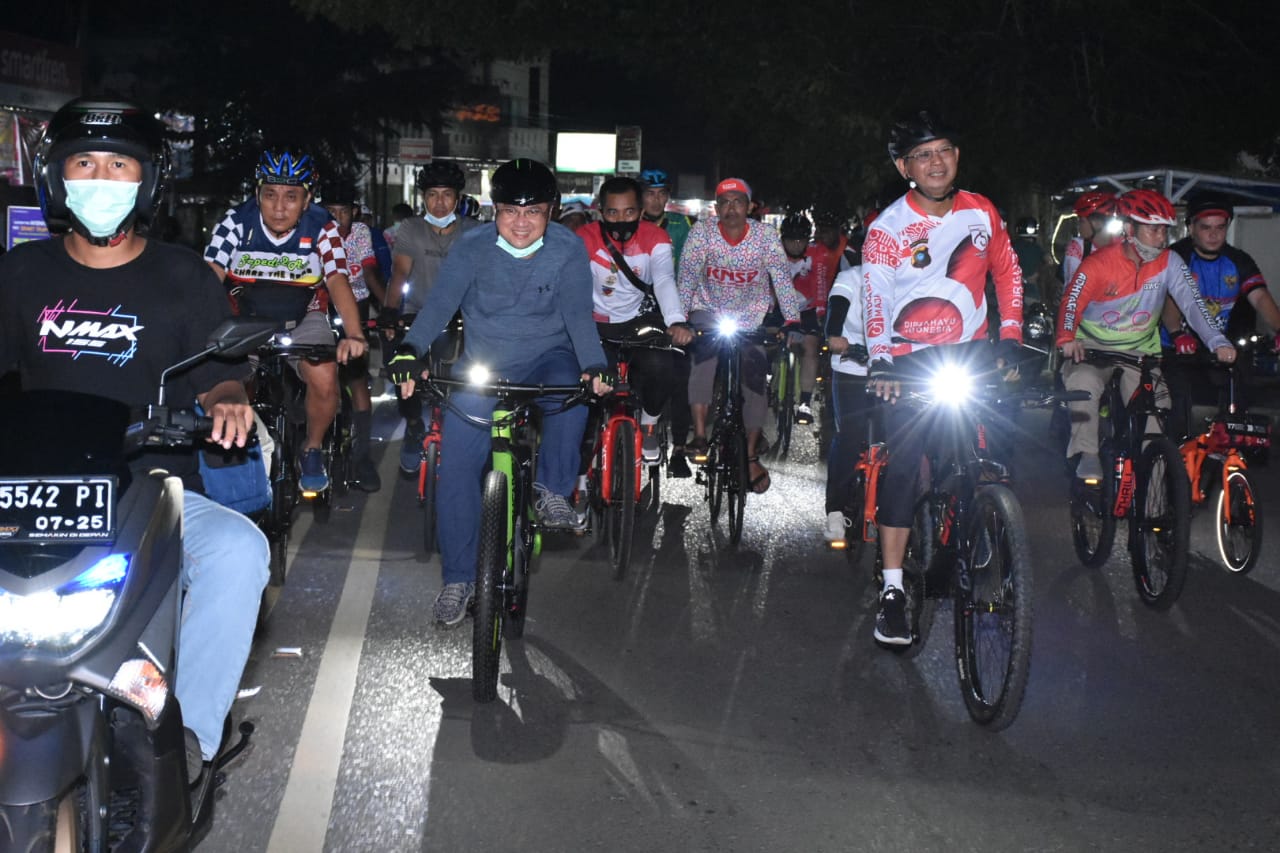 SIBERINDO, BABEL – Gubernur Kepulauan Bangka Belitung (Babel), Erzaldi Rosman bersama Forum Koordinasi Pimpinan Daerah (Forkopimda) Provinsi Kepulauan Bangka Belitung serta komunitas sepeda se-Babel melaksanakan kegiatan “Gowes” atau bersepeda malam hari, berkeliling Kota Pangkalpinang, Rabu (11/11/20).