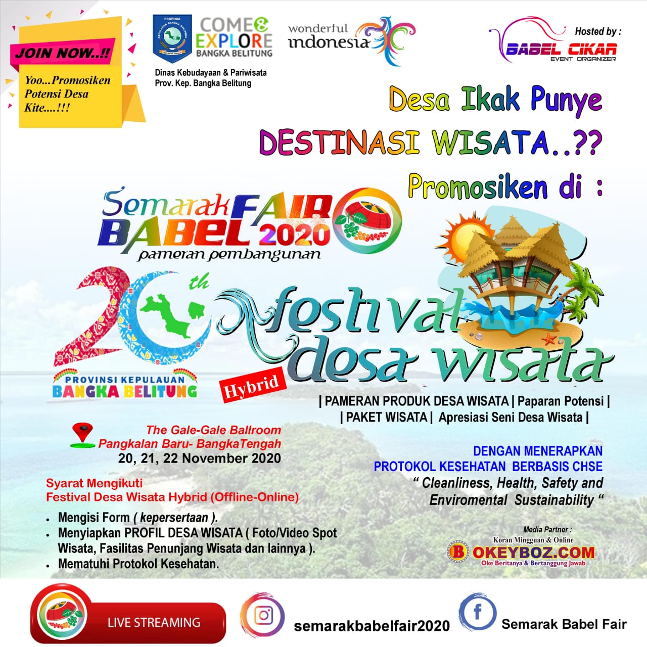 SIBERINDO, BABEL – Festival Desa Wisata Bangka Belitung merupakan rangkaian dari kegiatan Semarak Babel Fair 2020 Hybrid. Kegiatan ini akan berlangsung di Arena Pameran Babel Fair di Exhibition Hall The Gale-Gale Pangkalan Baru.