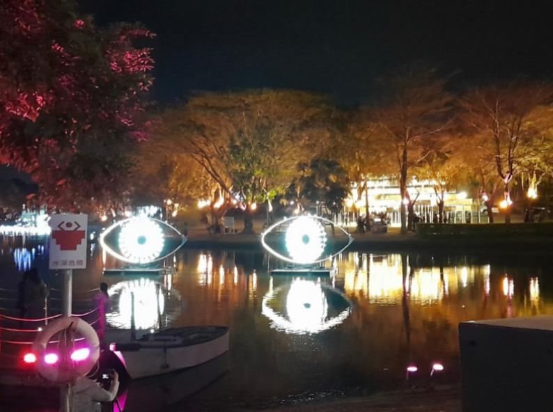 Hal itu terlihat pada karya pertama yang dimunculkan di area pertama. Begitu memasuki area festival, pengunjung langsung disambut dengan instalasi lampu berbentuk dua bola mata tiga dimensi di tengah perairan. Bola mata akan terus menatap pengunjung dari berbagai posisi pengunjung melalui pencahayaan tersebut.