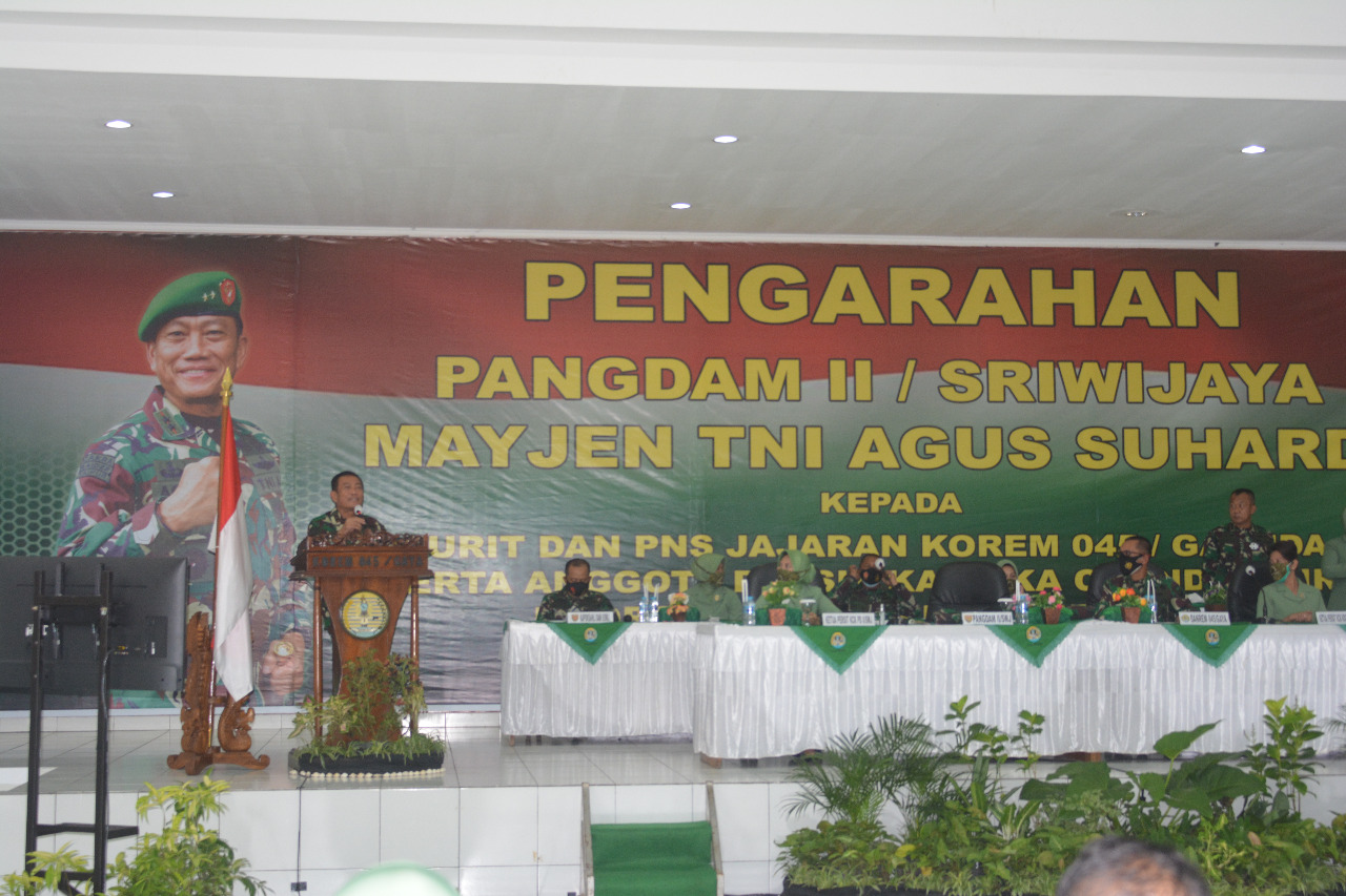 Pengarahan tersebut dalam rangka kunjungan kerja pertama Pangdam ke Korem 045/Garuda Jaya dan Jajarannya setelah menjabat sebagai Panglima Kodam II/ Sriwijaya.