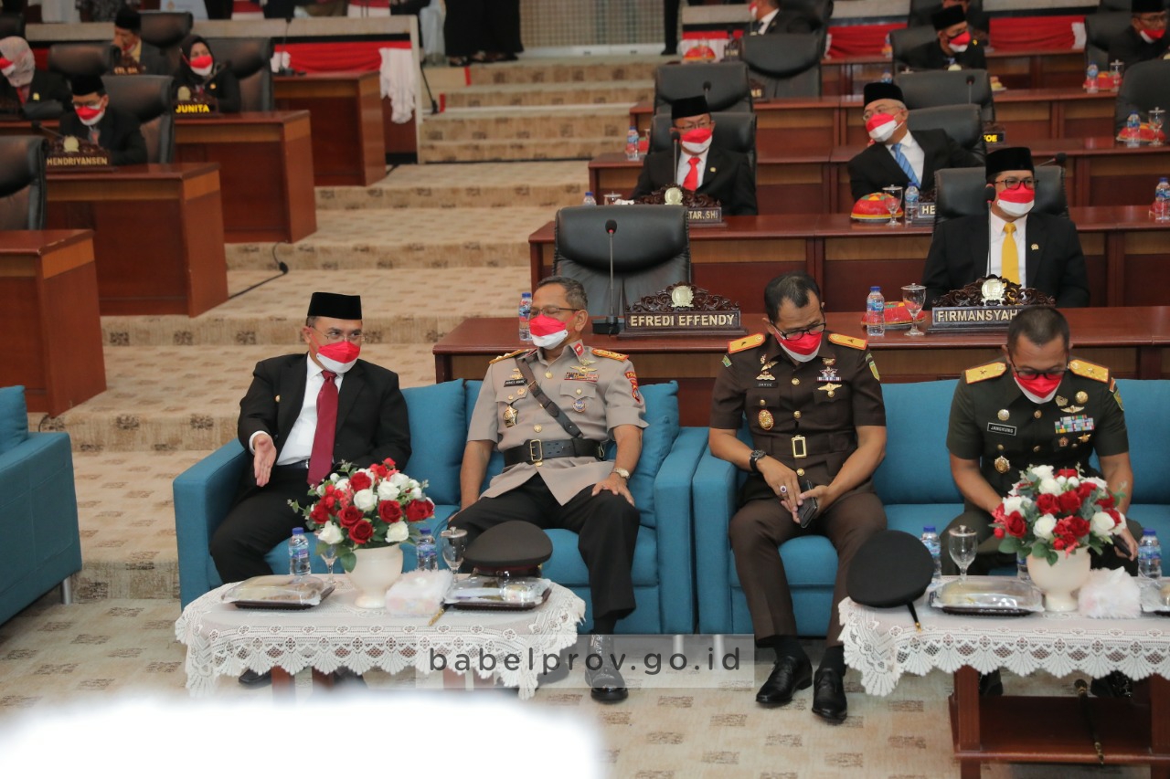 SIBERINDO, BABEL – Gubernur Kepulauan Bangka Belitung (Babel), Erzaldi Rosman dan Wakil Gubernur Babel, Abdul Fatah mengikuti rapat Paripurna dengan Agenda Mendengarkan Pidato Kenegaraan Presiden Republik Indonesia (RI) Joko Widodo Dalam Rangka HUT ke-76 Kemerdekaan RI di Gedung DPRD Babel, Senin (16/8).