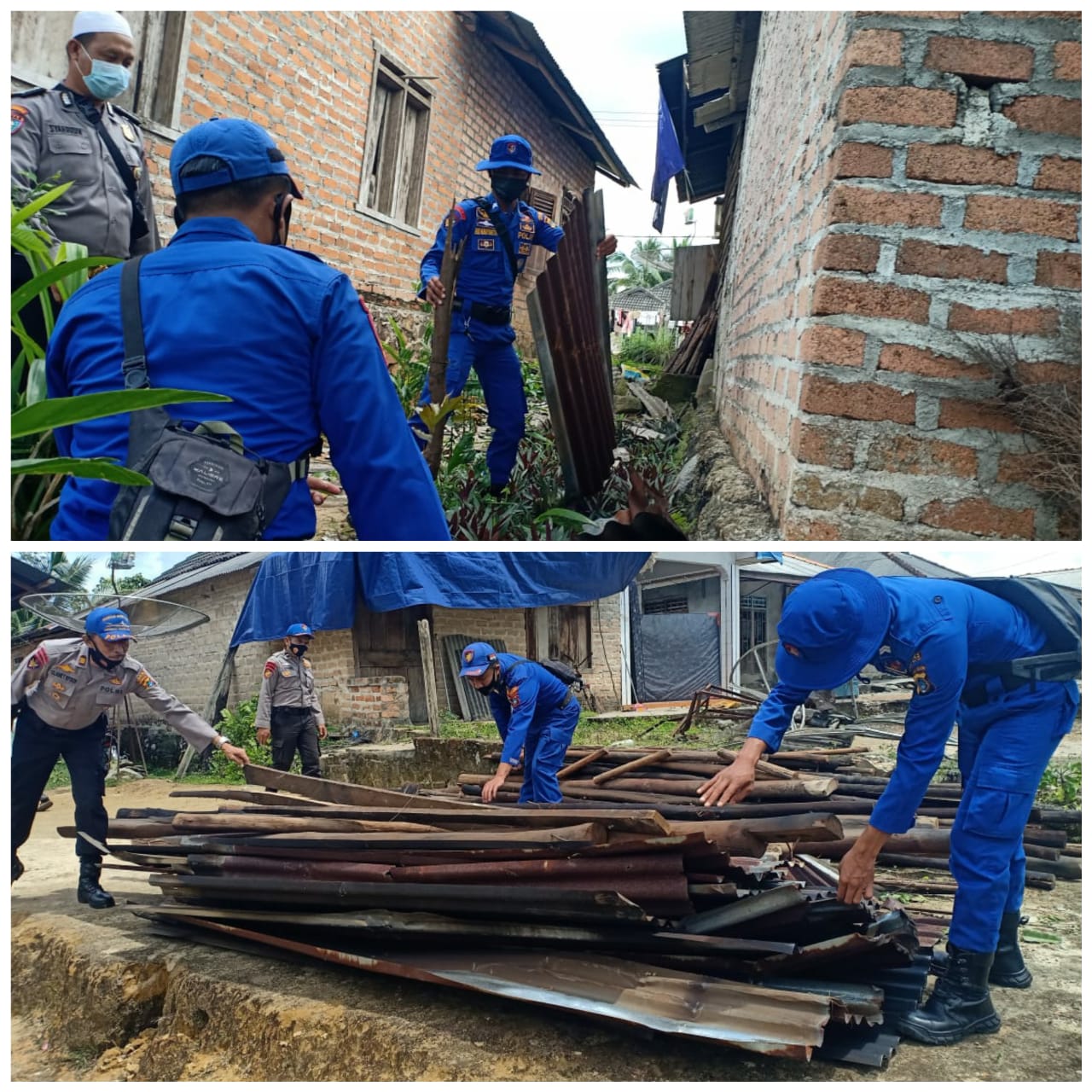 Personil Polairud Polres Bangka Selatan nampak ikut serta membersihkan puing-puing atap bangunan dan memperbaiki rumah warga yang rusak akibat diterjang puting beliung.