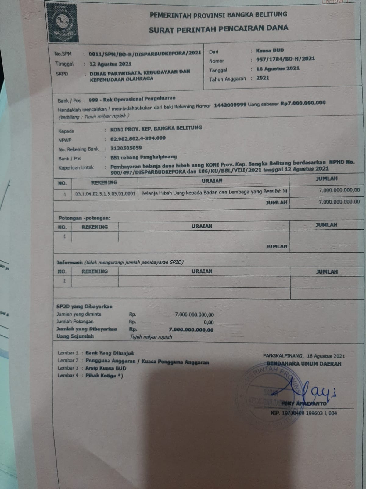 Foto : SP2D Dana KONI Babel