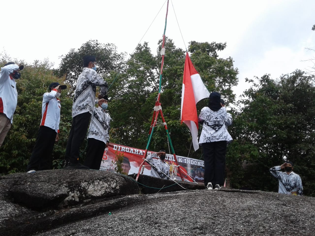Tepat pukul 10.00 wib, upacara bendera di gelar diatas Puncak Bukti Nenek dilaksanakan dengan sangat sederhana dan berlangsung khidmat yang diikuti sejumlah elemen masyarakat dan tetap menerapkan protokol Covid 19.