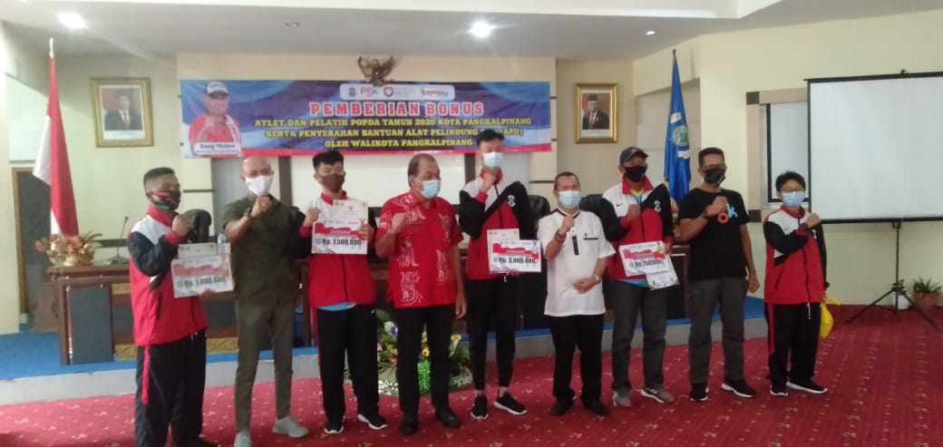 SIBERINDO, BABEL – Pemerintah kota Pangkalpinang membagikan bonus kepada atlet Popda yang berprestasi tahun 2020 di gedung pertemuan kota Pangkalpinang, Jum’at (18/12/2020) siang