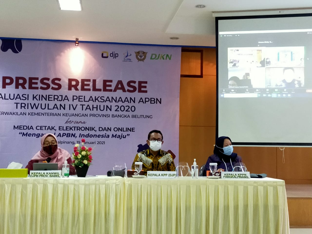 Caption : Kepala Perwakilan Kementerian Keuangan Provinsi Kepulauan Babel, Fahma Sari Fatma (tengah) saat press release evaluasi kinerja pelaksanaan APBN Triwulan IV Tahun 2020 di aula Kanwil Ditjen Perbendaharaan (DJPb) Babel, Selasa (19/1/2020).