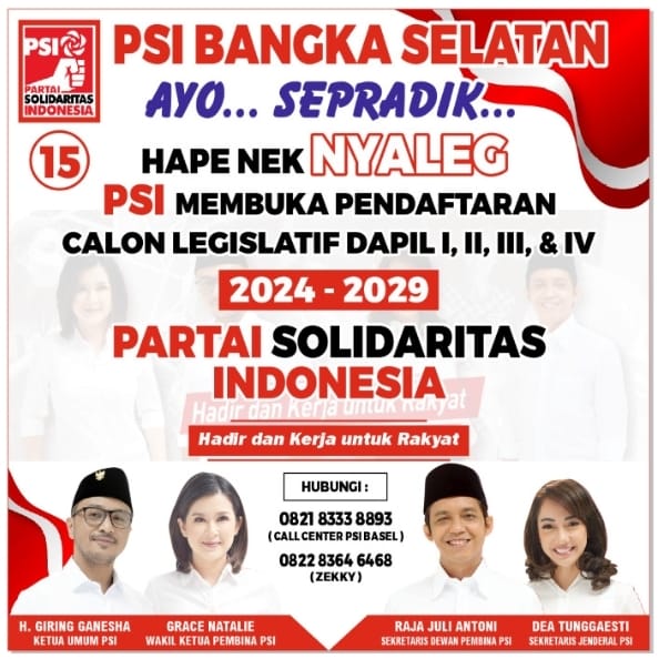 BANGKA SELATAN – Dewan Pimpinan Daerah (DPD) Partai Solidaritas Indonesia (PSI) Kabupaten Bangka Selatan (Basel) membuka pendaftaran bakal calon legislatif (Bacaleg) pada persiapan Pemilu 2024 mendatang.