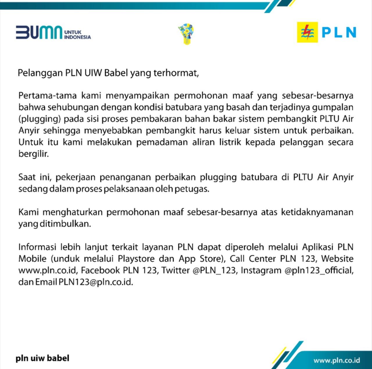 Humas PLN wilayah Bangka Belitung Triputra saat dikonfirmasi media ini melalui saluran telepon Kamis, 24/2/2022, menjelaskan pemadaman bergilir ini dilakukan karena terjadi gumpalan (plugging) pada proses pembakaran bahan bakar sistem pembangkit PLTU Air Anyir.