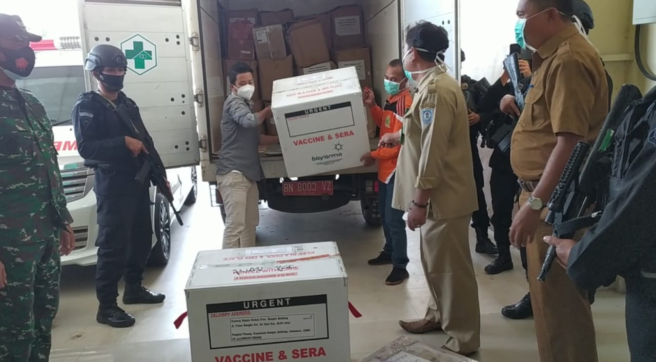 Pendistribusian vaksin yang bersumber dari APBN tersebut dikawal ketat oleh TNI/Polri bersenjata lengkap dari Pangkalpinang menuju Bangka Selatan.
