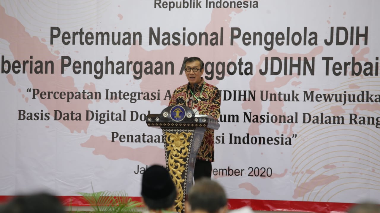 Menhumkam Yasonna Laoly mengapresiasi seluruh anggota JDIHN yang telah melakukan reformasi dan inovasi dalam rangka memberikan kemudahan akses dokumentasi dan informasi hukum di masing-masing lembaga.