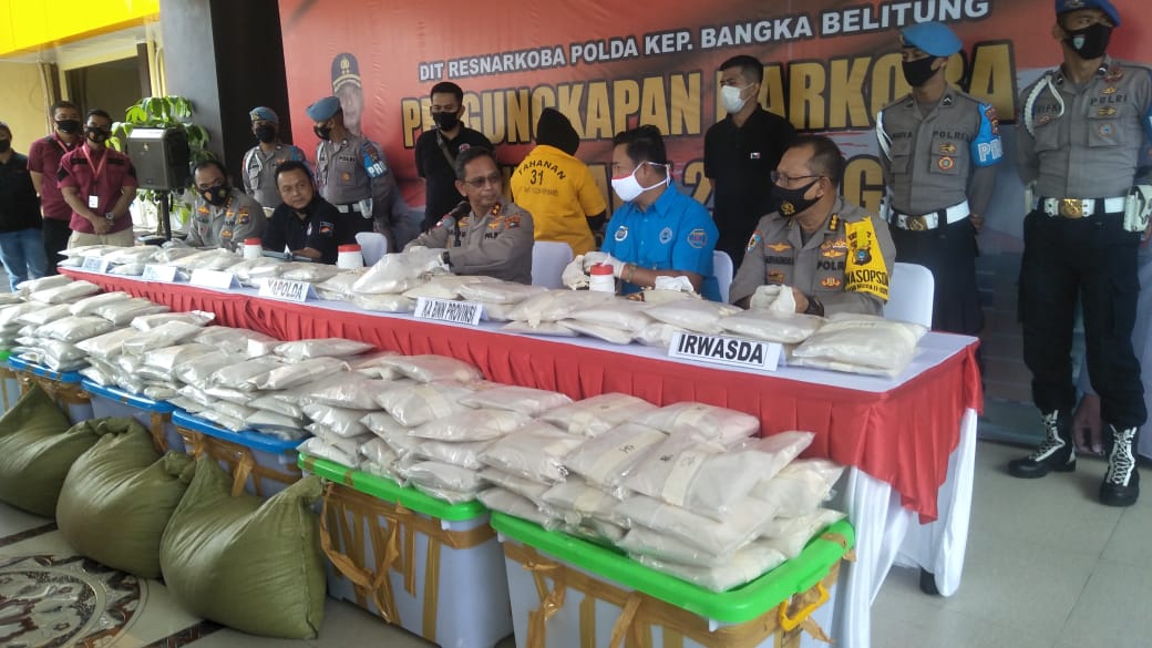 Dihadapan awak media, Irjen Pol Drs. Anang Syarif Hidayat menjelaskan, pada hari Selasa (21/7), sekira pukul 17.30 Wib, DitresNarkoba Polda Babel menerima informasi dari masyarakat, bahwa di salah satu jasa pengiriman barang antar pulau yang beralamat di Jl. Pertamina Kelurahan Lontong Pancur, Kota Pangkalpinang, ada benda mencurigakan yang diduga Narkotika yang disembunyikan di dalam karung berwarna hijau berisi jagung.